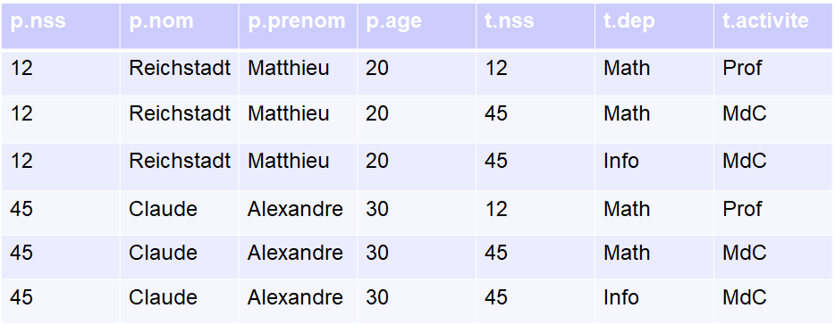 Le produit cartésien consiste à prendre deux relations et à faire toutes les associations de tuples possibles entre ces deux relations.