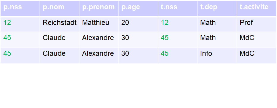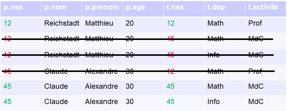 La jointure naturelle reprend a peu près le principe du produit cartésien, mais lui ajoute une petite condition. Cette condition, et bien elle est très basique: si des attributs ont le même nom (ou si la jointure est forcée entre attributs différents), alors ils devront avoir la même valeur dans le tuple pour que ce dernier soit gardé.